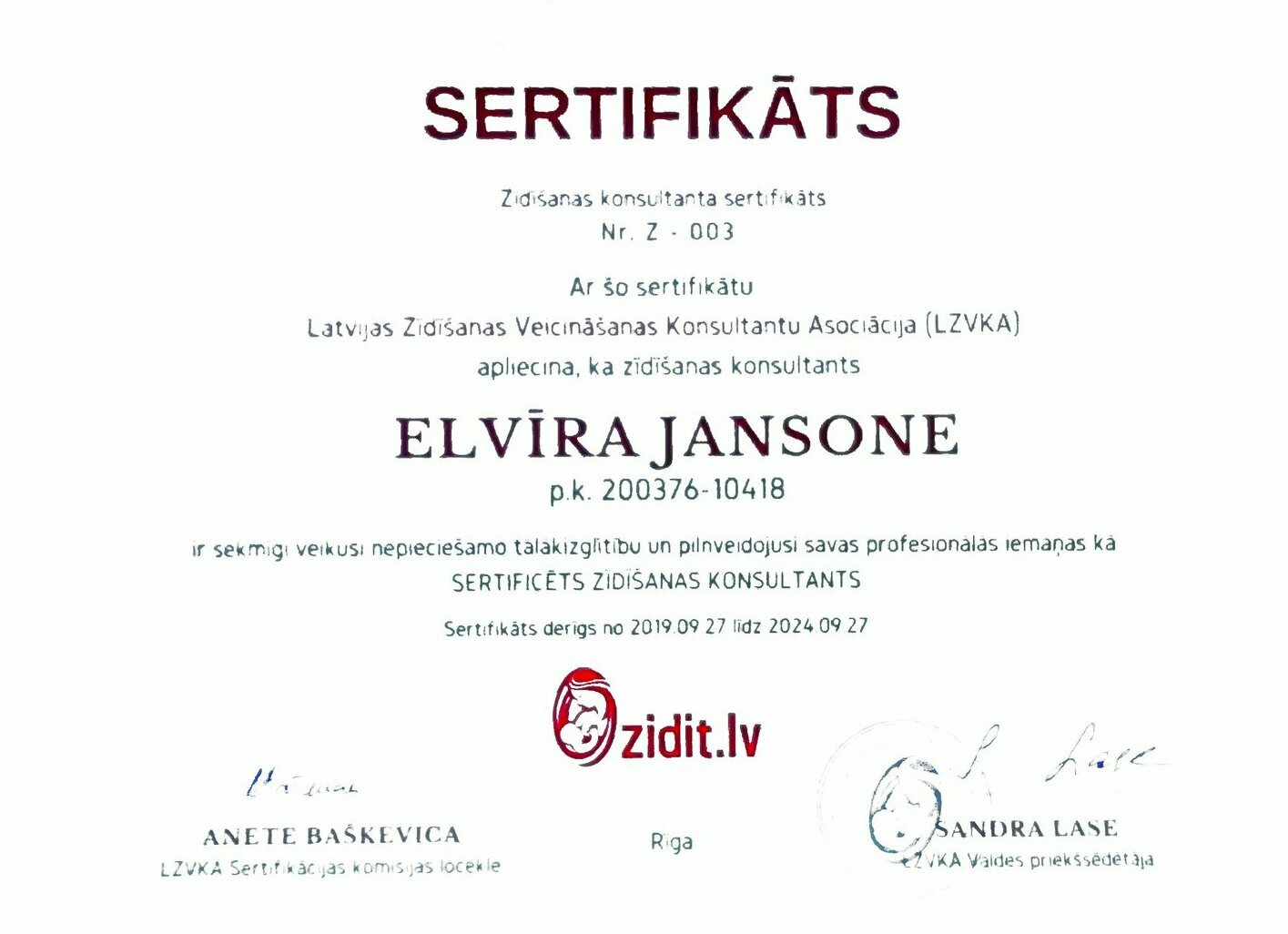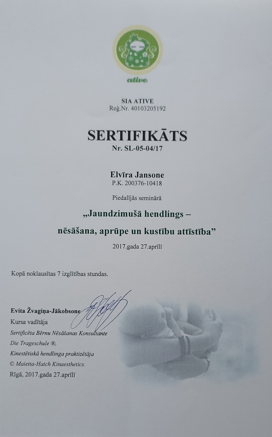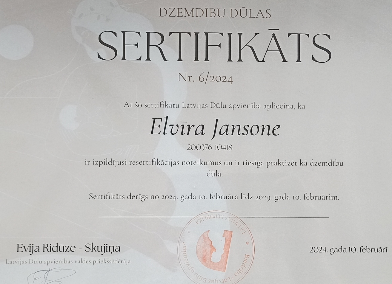 Сертифицированный консультант по грудному вскармливанию (LZVKA) и сертифицированная доула (Latvijas Dūlu apvienība).