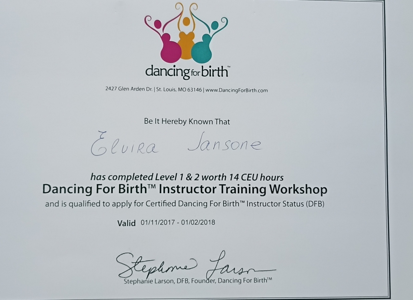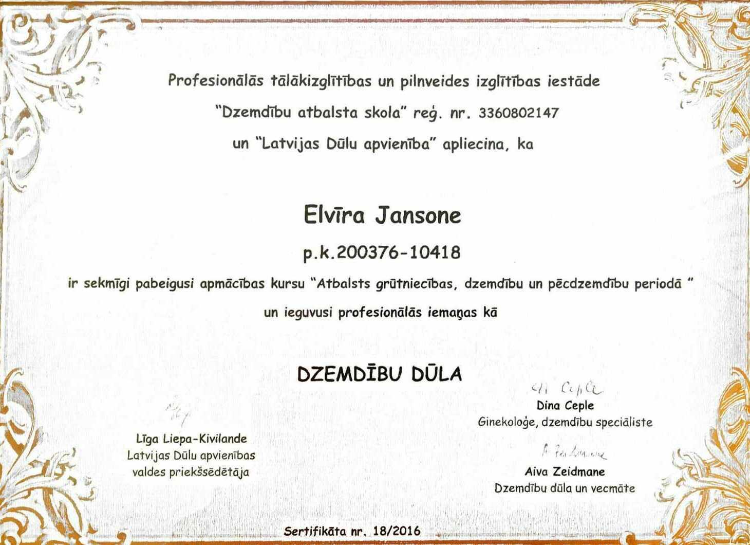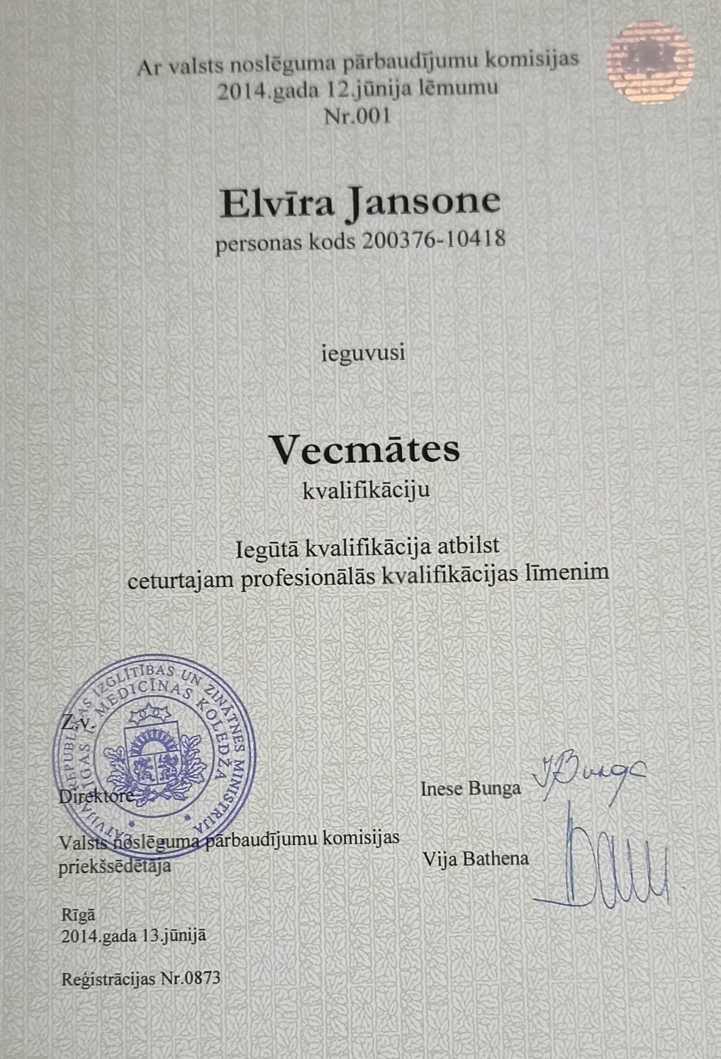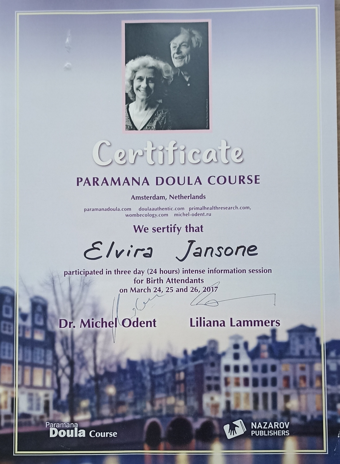 Сертифицированный консультант по грудному вскармливанию (LZVKA) и сертифицированная доула (Latvijas Dūlu apvienība).